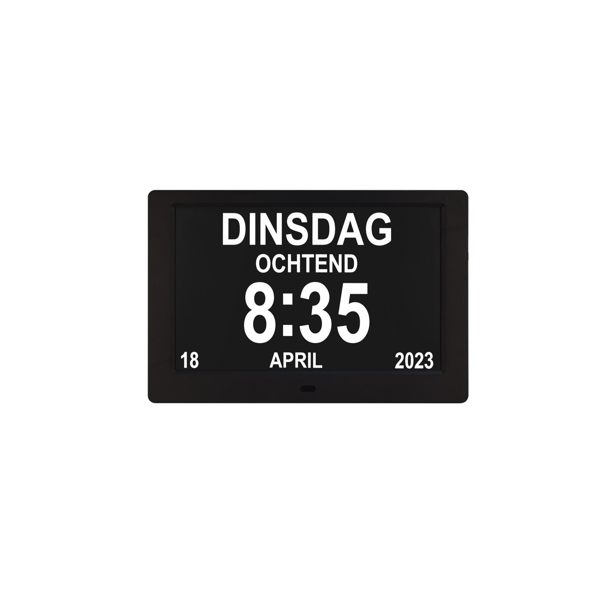 ALLY Clock ist eine Digitaluhr, die Uhrzeit, Datum und Wochentag auf einem großen 20-Zentimeter-Bildschirm anzeigt.