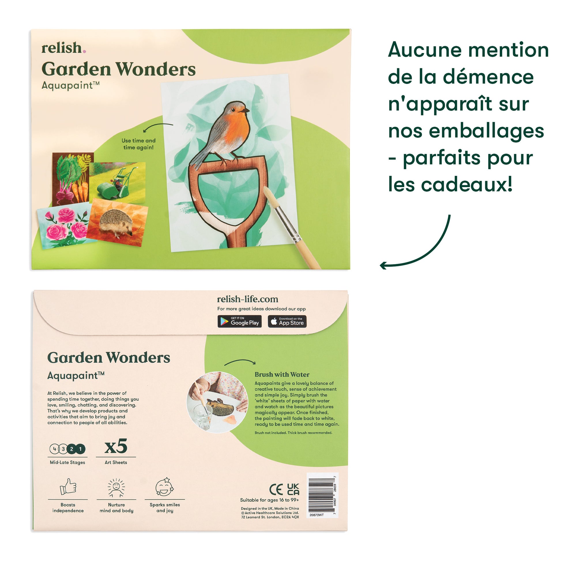 Jedes Set besteht aus fünf sorgfältig ausgewählten Bildern, die zur Konversation anregen sollen. Die Leinwand ist zunächst weiß mit schwarz umrandeten Formen. Wenn das Wasser des Pinsels mit der Leinwand in Berührung kommt, kommen wunderschöne Farben zum Vorschein. Diese kreative Aktivität wurde für und mit Menschen mit Demenz entwickelt, stimuliert und vermittelt Erfolgserlebnisse.