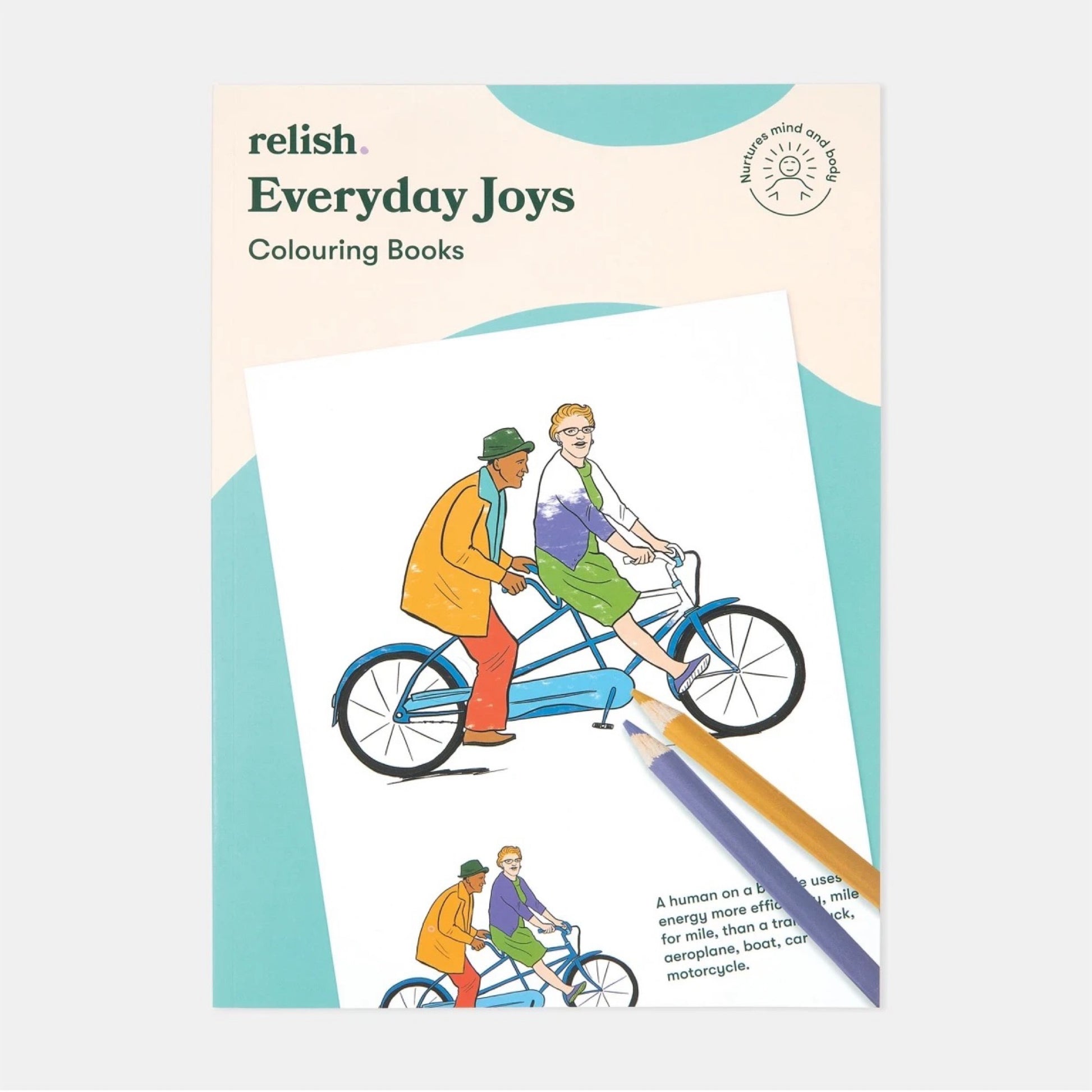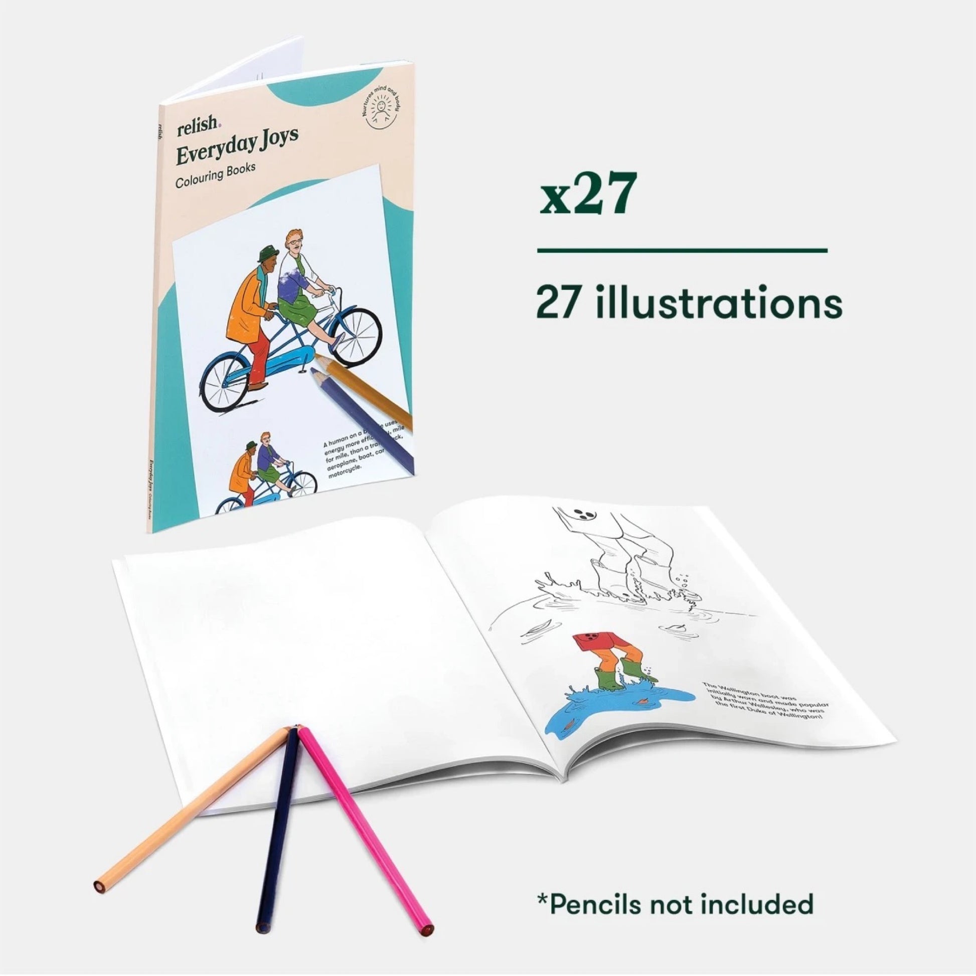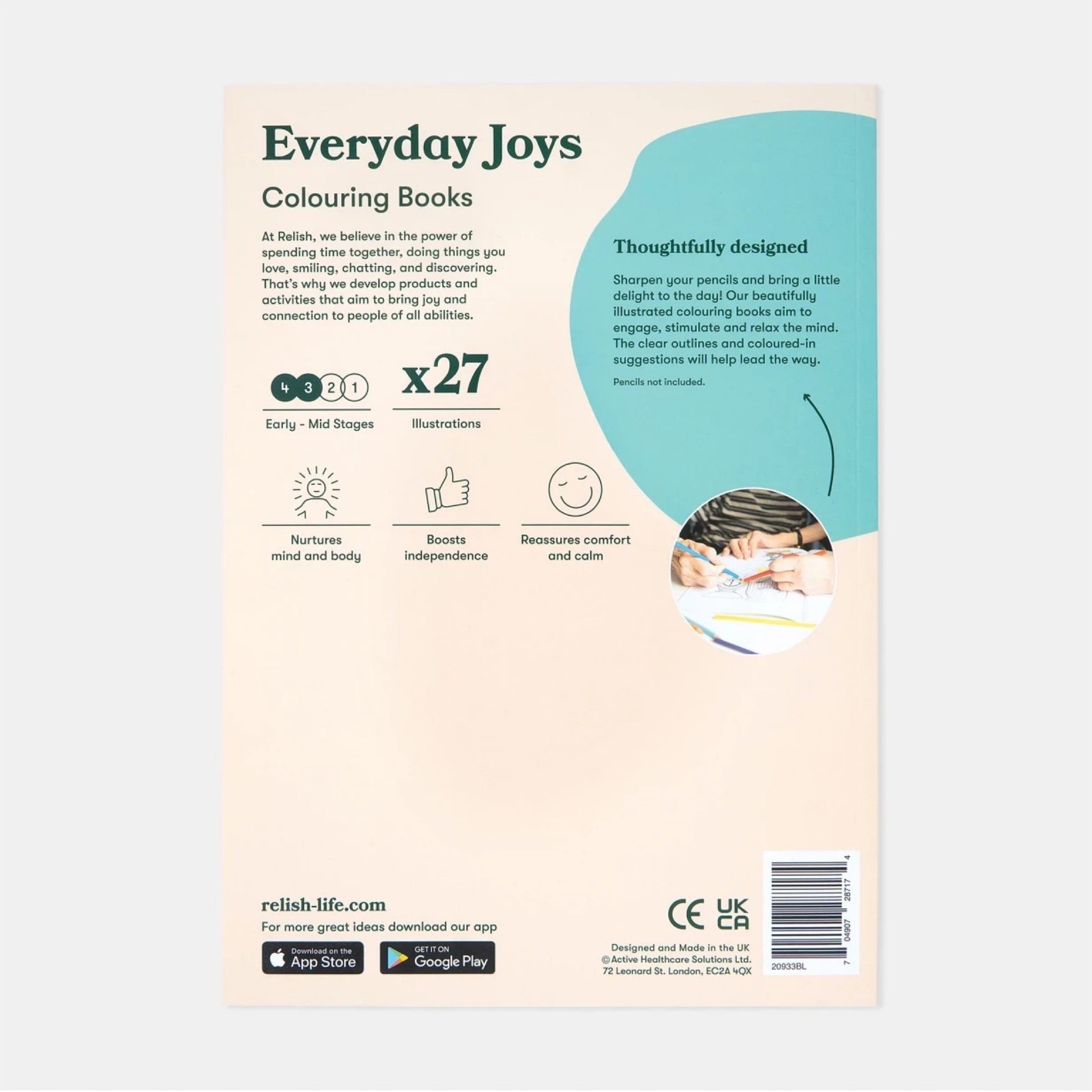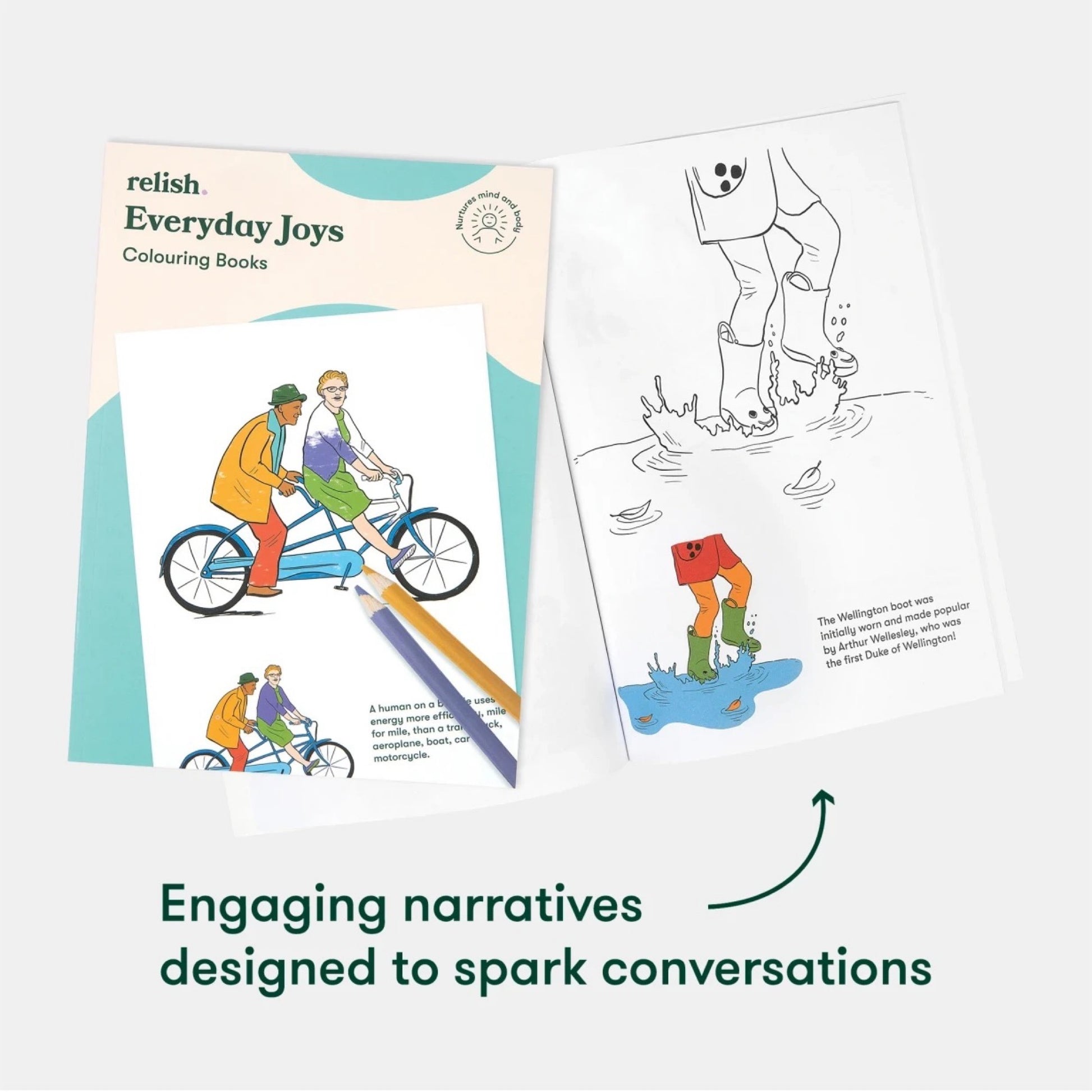 Relish-Malbücher sind eine therapeutische Aktivität für Menschen im frühen und mittleren Stadium der Demenz. Ihr Ziel ist es, den Geist zu beschäftigen, anzuregen und zu entspannen. „Everyday Joys“ bietet altersgerechte Bilder, die an die einfachen Freuden des Alltags erinnern und Erinnerungen wecken und Gespräche anregen können. Diese Aktivität wurde in Zusammenarbeit mit Menschen mit Demenz entwickelt und bietet klare Umrisse und Beispielbilder, um Künstler zu ermutigen.
