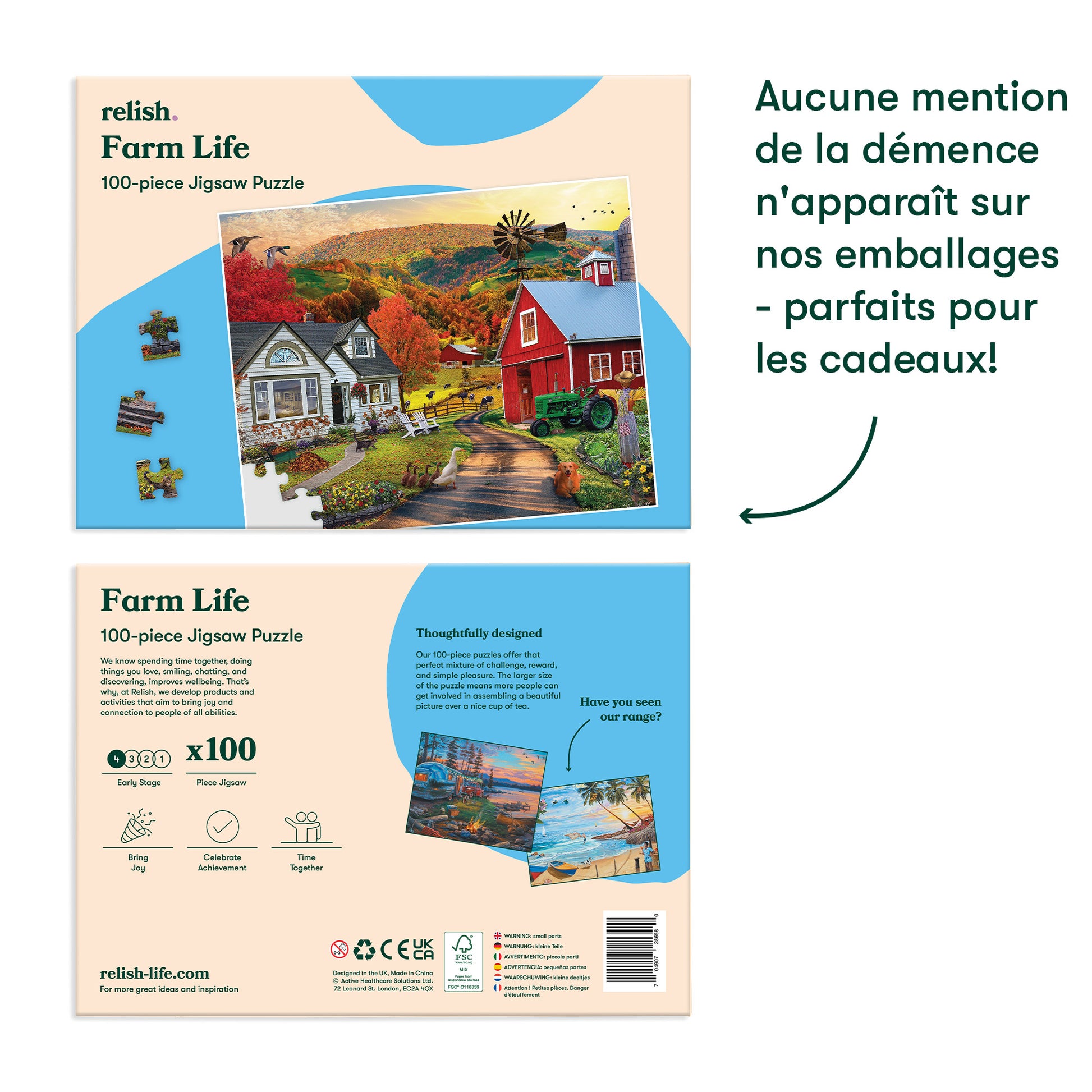 Das 100-teilige Puzzle „Relish“ für Menschen mit Demenz ist eine tolle gemeinsame Aktivität für Familien und Freunde. Das fertige Puzzle misst 37,5 cm x 30 cm und ist damit das größte Puzzle unserer Sammlung. Die idyllischen Szenen wurden entwickelt, um Menschen in den frühen Stadien der Demenz zu erfreuen. Sie sollen Erinnerungen wecken und Gespräche anregen, sobald das Puzzle fertig ist.
