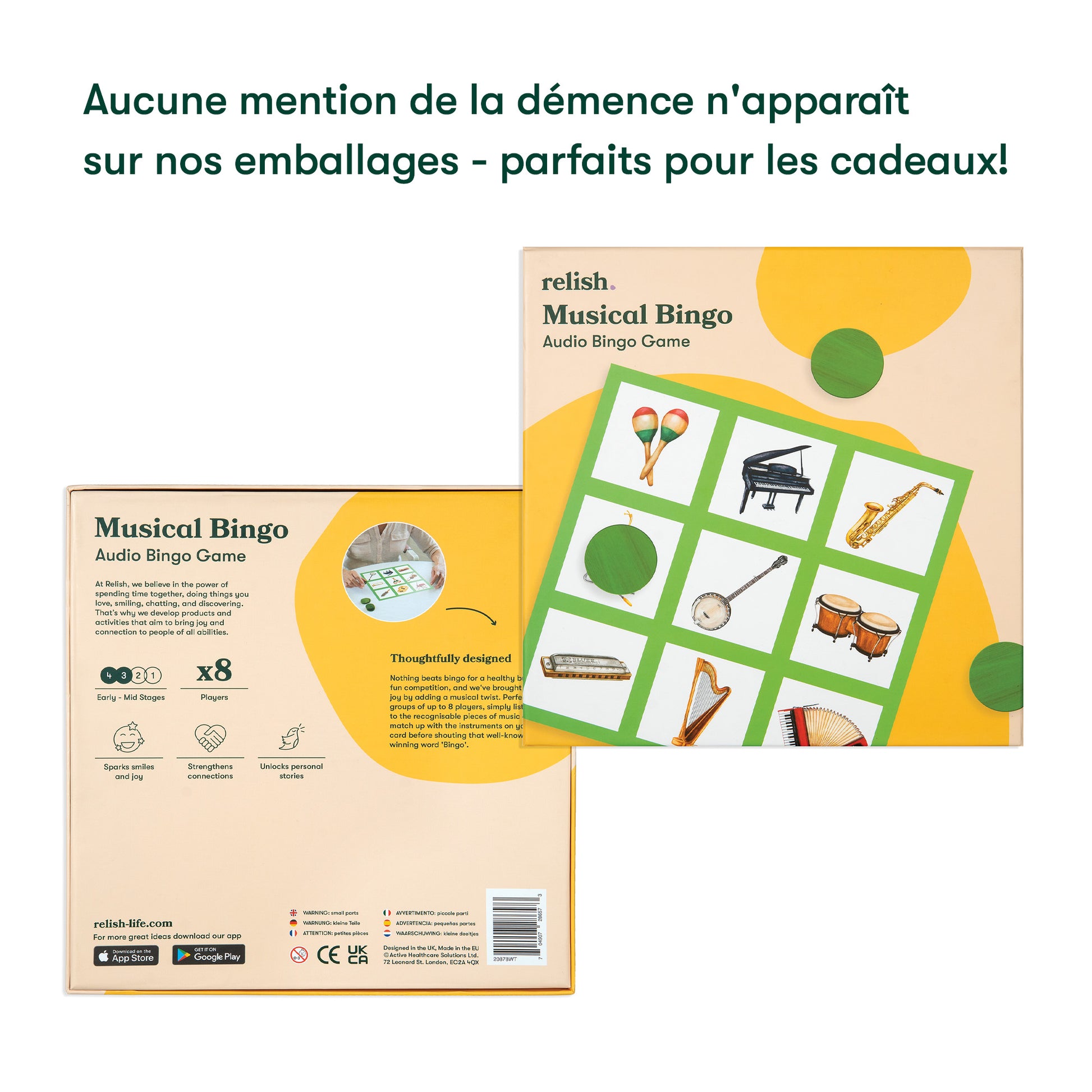 Conçu pour tous les stades de la démence, ce jeu présente des mélodies évocatrices soigneusement sélectionnées pour déclencher des souvenirs. Retournez dans les rues de Paris avec des sons d'accordéon déambulatoire et escaladez les Highlands écossais avec les cornemuses traditionnelles qui résonnent. Joueurs, préparez-vous à être transportés dans un autre temps et un autre lieu. Mais n'oubliez pas de crier Bingo !